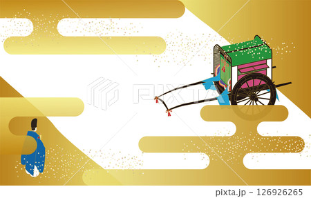 日本の歴史的な貴族の乗り物、牛車と牛車に乗る女性と狩衣の男性のイメージイラスト。