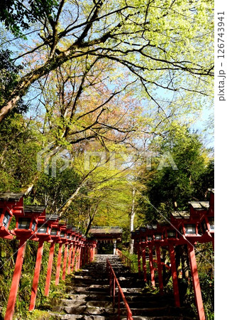 京都市 貴船神社本宮の奥宮側参道と鳥居と新緑