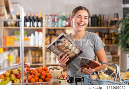 Elderly retired senora buying bread and pastries in grocery section of the supermarket