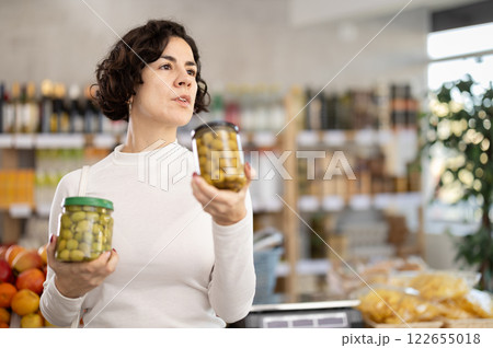 Mature couple husband and wife choose sauerkraut cabbage and pickles in supermarket