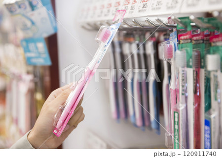 スーパーで歯ブラシを買う女性手元
