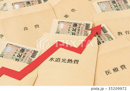 光熱費の封筒に入った紙幣と上昇矢印 支出 家計