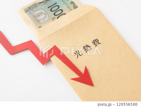 光熱費の封筒に入った紙幣と下降矢印 支出 家計 縮小