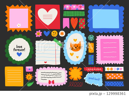 Stickers, note papers, planner doodles vector illustrations collection. Light colors set for diary, notebook.