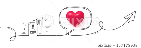 Attached info line icon. Continuous line with share plane. Information guide sign. Attachment file symbol. 3d heart in speech bubble. Attached info single line ribbon. Loop curve pattern. Vector