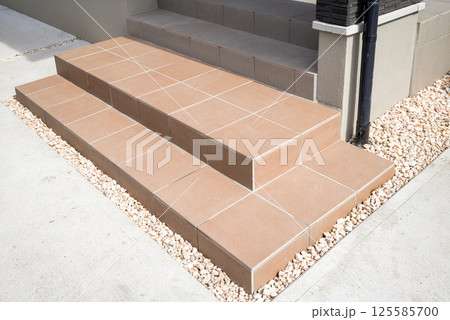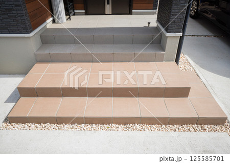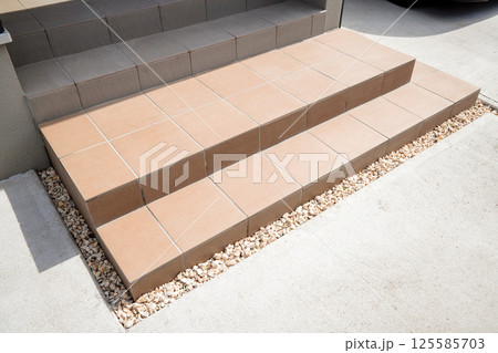 住宅イメージ 玄関アプローチ 貼り替えた階段の茶色いタイル