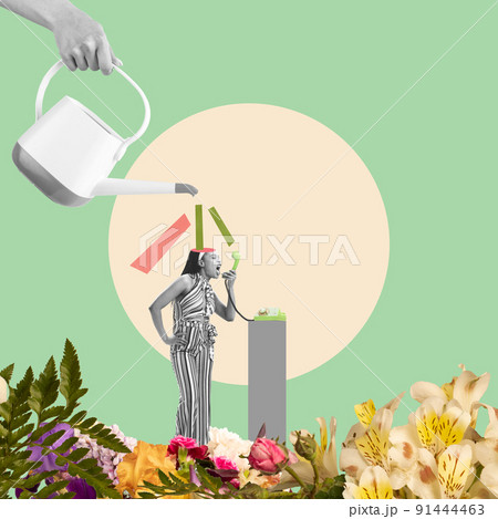 Contemporary art collage. Ideas, imagination, art, surrealism. Young girl talking on phone. Concept of social issues, propaganda, mental health