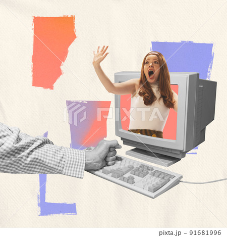 Contemporary art collage. Stylish young girl sticking out computer monitor with shocked expression. Revealing information