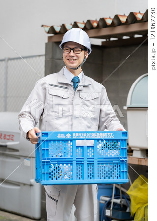 ゴミを回収する作業着の男性