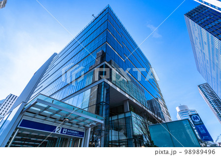 日本の横浜都市景観 新高島駅連絡口や新高島駅周辺のオフィスビルなどを望む