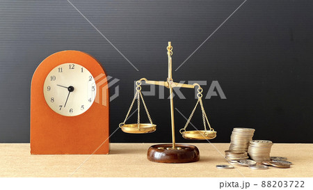 金の天秤と時計とお金_黒背景