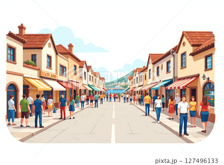Vibrant illustration showcasing a sunny day on a bustling street with pedestrians, charming buildings, and flourishing greenery