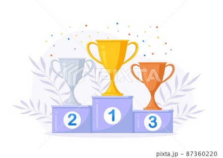 Gold, silver and bronze trophy cup, goblet on podium. Winner award for 1st, 2nd, 3rd place. Prizes for champions