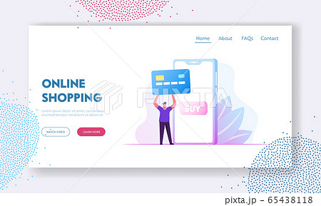 Online Payment Website Landing Page. Man Buyer Hold Credit Card Stand near Smartphone with Buy Button on Screen