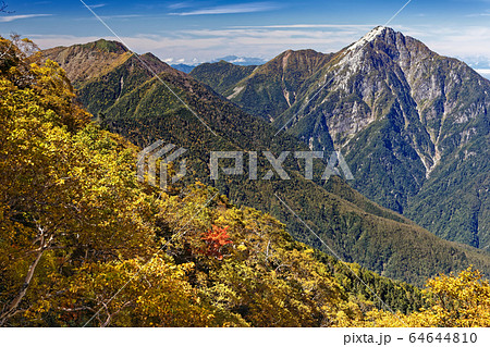 鳳凰三山・地蔵岳の賽の河原のダケカンバの黄葉と甲斐駒ヶ岳