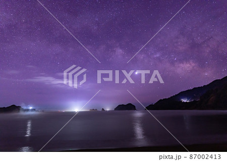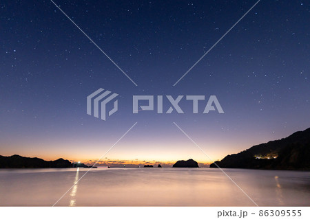 宮崎県日南市南郷町男女島がある夫婦浦海岸の上に広がる星空に横に流れる天の川と海を照らす金星