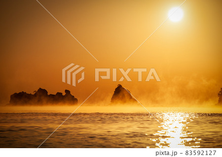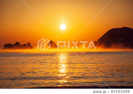 太平洋日向灘に昇る日出で白銀に染まった日南海岸の贄波浜と鳥帽子島に松島と黒島と間に広がる毛嵐