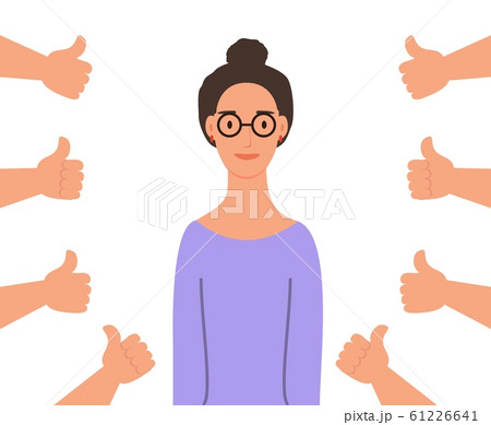Smiling happy young woman surrounded by hands with thumbs up. Concept of public approval