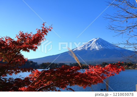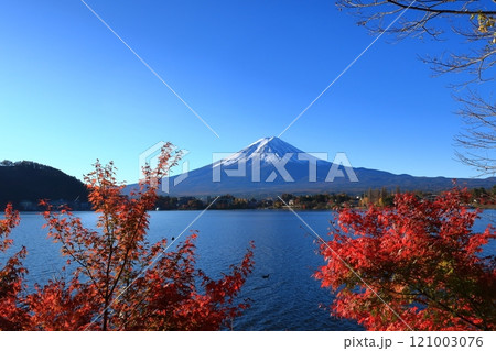 日本の秋・冠雪富士遠景と湖畔の真っ赤な紅葉・横位置