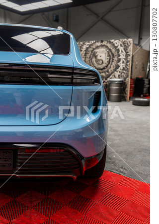Rear view of a light blue Porsche Macan parked indoors on a red floor mat. Background includes a patterned wall, tires, tools, and overhead lighting.