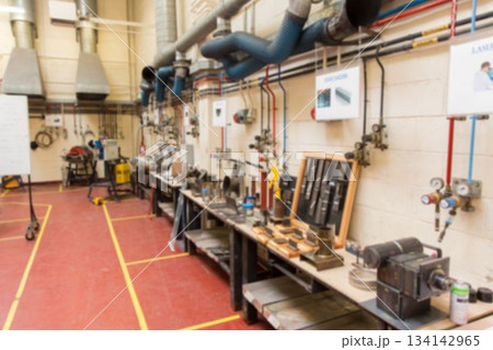 Row of metal workbenches is being shown in flat design workshop, with vices and gauges