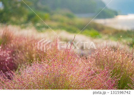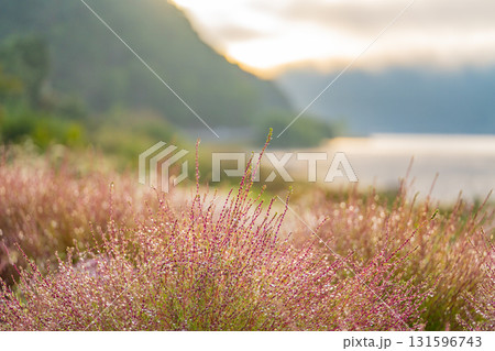 【山梨県】河口湖大石公園 朝の光を浴びて、朝露が光る湖畔のコキア