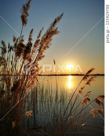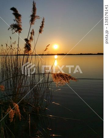 Sunset over the reeds on the lake