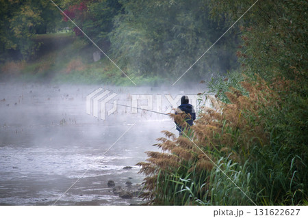 A solitary angler casts a line into a misty lake surrounded by autumn foliage.