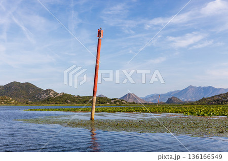 Tranquil river scene with a tall red navigation pole