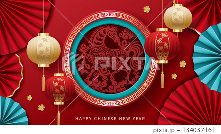 燈籠、紅色藍色摺扇、圓框與馬年剪紙,中國元宵節或農曆新年賀年橫幅廣告海報宣傳單背景圖向量素材圖片