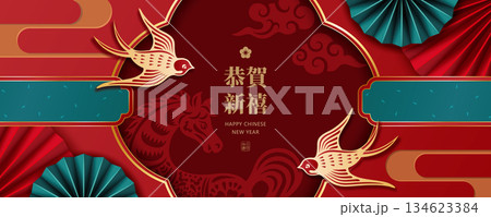 中國農曆新年3D立的摺紙工藝風格賀年橫幅行銷廣告海報宣傳單圓框背景圖向量素材圖片