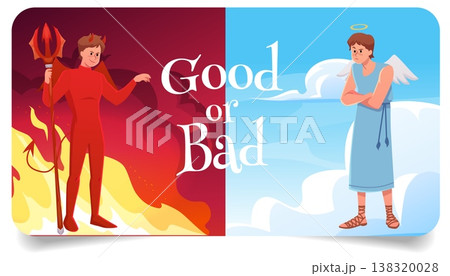 Good or bad vector flat banner, cartoon heaven and hell, devil and angel on different sides. Fire flame blue sky clouds