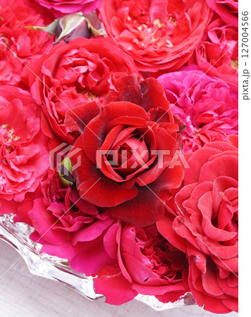 Red roses on water in glass bowl.