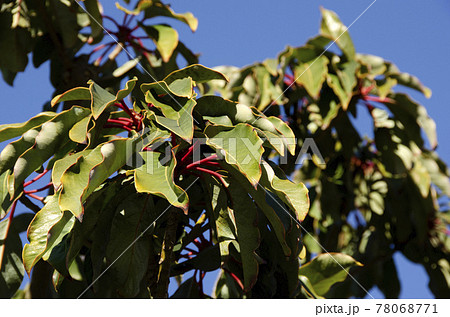 自然 植物 アカメガシワ、芽吹いた若葉は鮮やかな赤色ですが冬芽は灰色のモンスター風