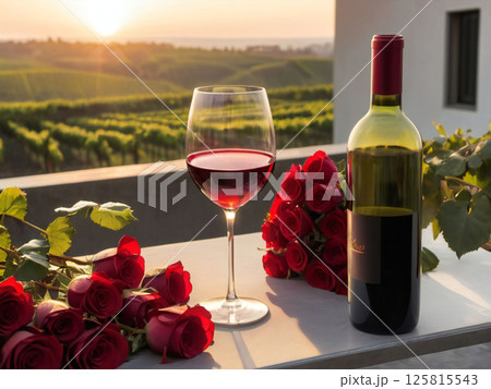 Delight. Still life with wine glasses, bottles, grapes on wooden table in wine cellar. Panoramic window view of lush vineyards at sunset.