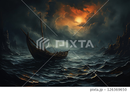 the sailboat sails through a stormy sea, a dark dramatic sky with gloomy clouds