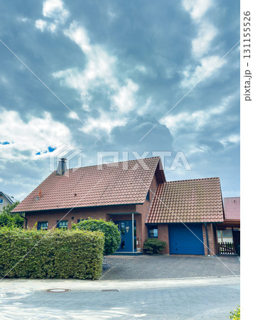 Modern suburban house with a red tiled roof and blue garage under a cloudy sky in a quiet neighborhood