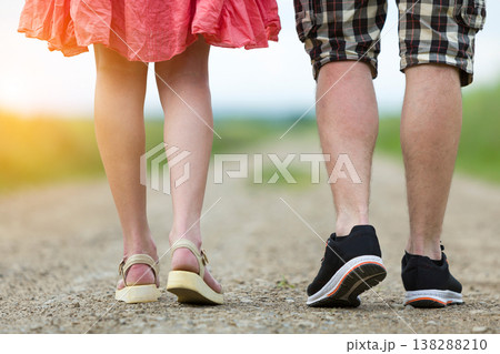Back view of legs of young slim woman in red dress and man in shorts walking together by ground road on sunny summer day on blurred background.
