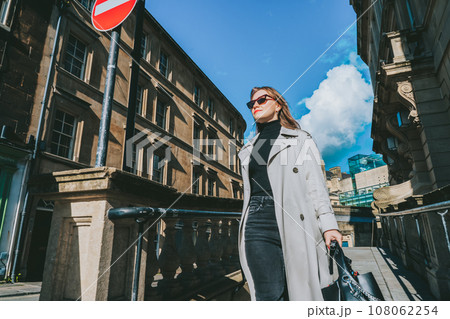 Outdoor autumn portrait of young elegant fashionable woman wearing trendy sunglasses, gray color coat, black jeans and turtleneck walking on street of European city in sunny day. street style fashion