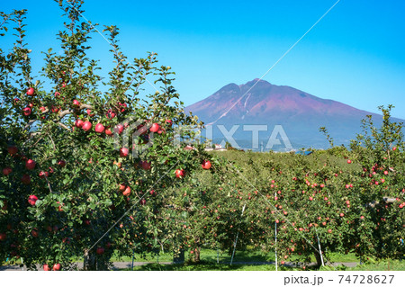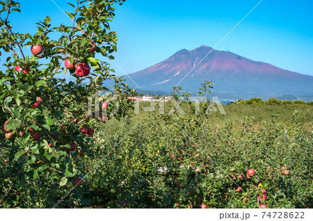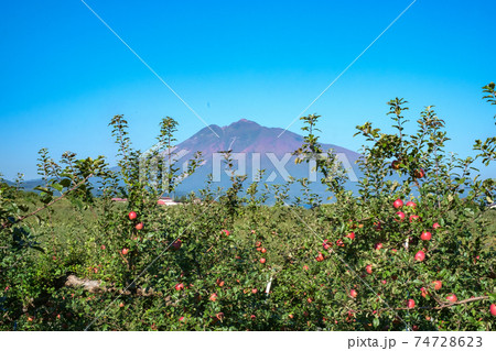 秋晴れの岩木山と真っ赤に実った林檎の果実