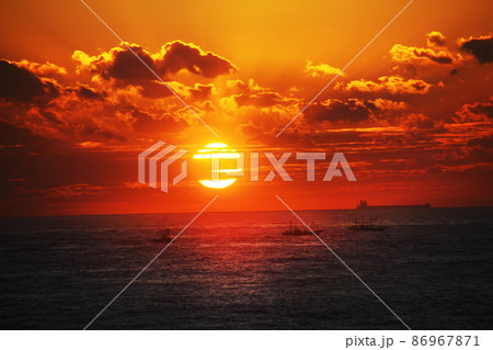 海の朝焼けと生まれたばかりの太陽、一日の始まり。漁師は仕事を終え漁港に向かう大洗い