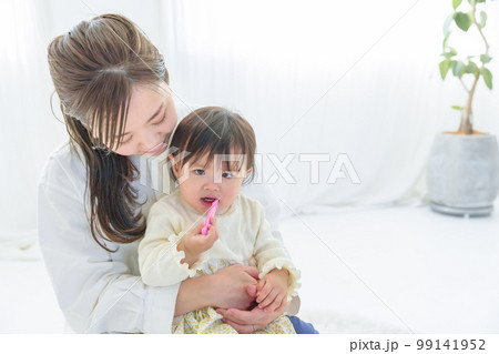 ママの膝の上で歯磨きをする赤ちゃん