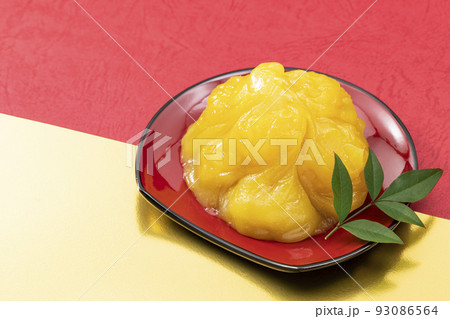 おせち料理その1_赤皿の栗きんとん_背景赤と金