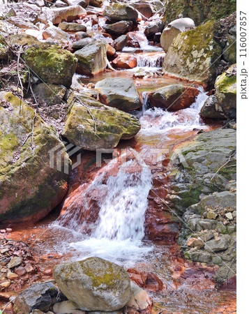 赤みを帯びた岩の間を流れる米子川