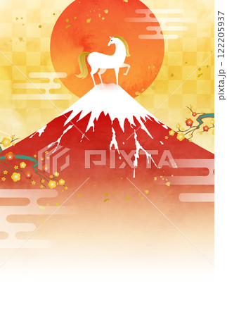 赤富士と初日の出の2026年午年の年賀状テンプレート(ベクターイラスト)