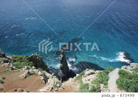 断崖の入り江の岩場と遠くに見える水平線