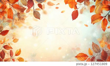 Autumn background with falling leaves and light bokeh effect on soft pastel gradient. Seasonal nature design. Warm and dreamy atmosphere.