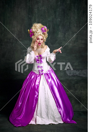 Historical portrait. Beautiful female model like classic historical character talking some secrets, gossips against vintage background.