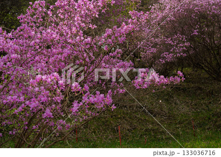 Pink flowers of Siberian rhododendron copy space. Rhododendron dauricum. Spring flowering of Altai rhododendron.