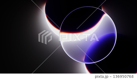 Liquid glass round frame with solar eclipse effect on black 3d background. Blue translucent circle with glowing neon orange rings, bright red halos on dark bg. Abstract space banner. 3D illustration